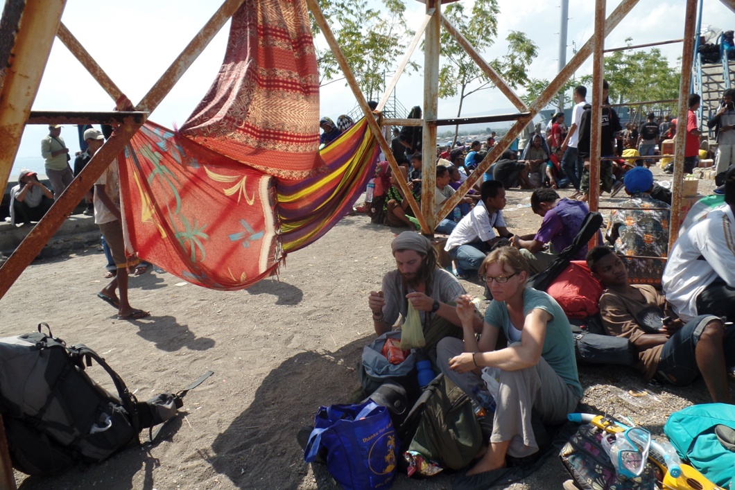It was hot on the dock of Maumere. When we got there there was still no sign of the ferry on the horizon and the heat was starting to get to us, so we set ourselves up for a long wait. Kate and Roy arranged their sarongs as a makeshift sun-shade.
