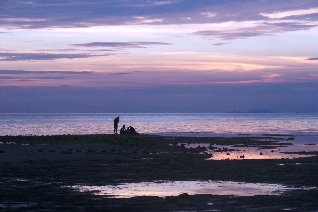 The calm, almost still, waters acted like a mirror as the sun melted into the horizon, dispelling rich colours, and the people working in the seaweed farm turned into dark silhouettes.