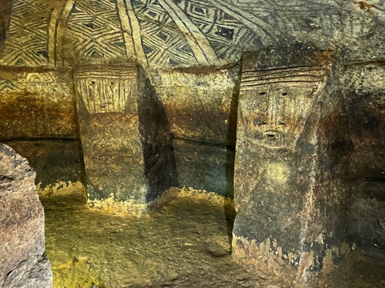 Most of the entrances face towards the west, and many feature anthropomorphic carvings and geometric patterns on their walls.