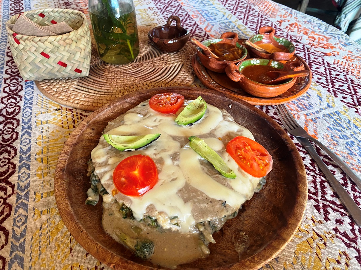 I also found a nice restaurant called Koatlikue Pachamama. I have mostly been cooking for myself since I came to Mexico (both for budget reasons and because the street food and traditional restaurants have been quite meat-heavy), but this place is vegetarian and specialises in ancestral food so I treated myself. The owner made me a local dish called Choluteca con Salsa de Champignons (cheesy mushrooms and other vegetables sandwiched between two homemade tortillas). It was delicious.