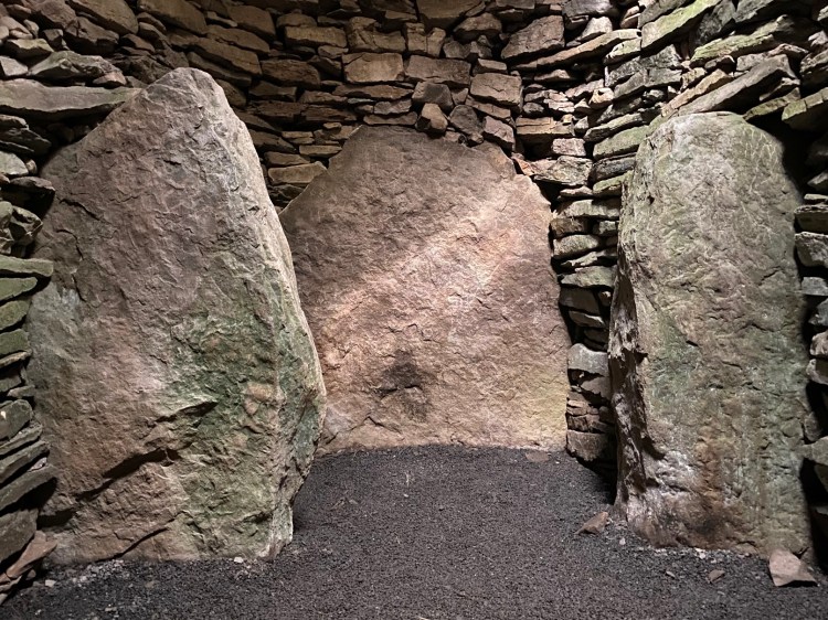 There are, however, some things that make this place special. First of all, is the size of it. It is huge. There were around thirty people on this tour and it wasn’t at all cramped when we were all inside. The drystone walls are made from stabs that were picked for their almost perfect flatness and many of them are huge and must have been a burden to not only bring here but also lift as they constructed the pyramidal curvature of the walls and its roof. This site is also surrounded by a henge – which is unusual for a burial cairn – and the four megaliths in the corners of the inner chamber are thought to predate the monument in its current form; hinting that this place served another ceremonial purpose before they converted it into a tomb.